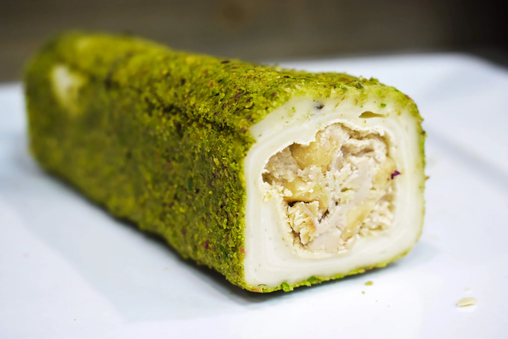 Hazelnut Butter and Hazelnut Pieces filled Turkish Delight covered with Marshmallow and Pistachio
